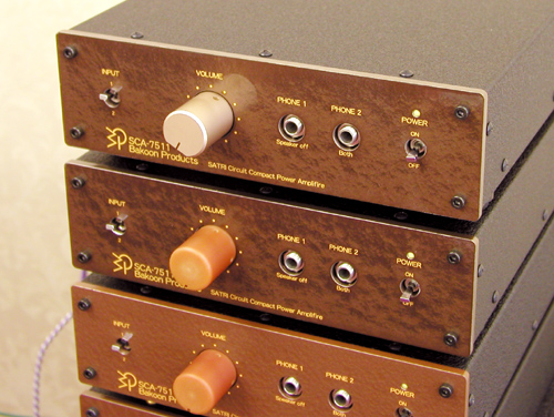 一番上と中央が新しいパネルのSCA-7511です。光の関係で少し違う色合いに見えますが同じものです。上がゴールドつまみを付けたモデル、下がベークライトつまみを付けたモデルです。一番下はベークライトつまみを付けた従来モデルです。