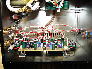 基本的なユニットは実装済みですので、ユニットの組み付けと、内部配線だけが作業です。私は、ケース内部でAC 100Vラインを引き回すのが嫌いなので、POWER SWは、前面パネルから背面パネルに変えました。これにより、ACラインは最短で配線できます。私は、ACは入れっぱなしですので、特に困りません。ACインレットも、FURUTECHのロジウムメッキに変えてあります。