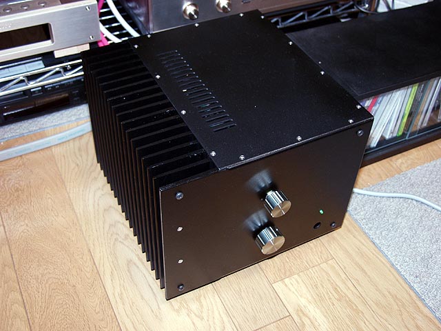 仕上げ無しのキットで購入したため、フロントパネルがありません。とりあえず、放熱板が黒なので、ケースもつや消しの黒で塗装してあります。その内、化粧パネルを付ける予定です。塗装は、アルミの表面をサンドペーパーで荒らしてから、スプレーで重ね塗りしました。ツマミは、付属していたものをそのまま付けてあります。