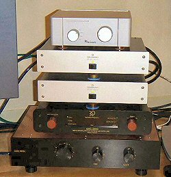 比較試聴システムとAT-301(左上) ケーブルの引き回しなどで条件をそろえるのに超積み重ねしました。