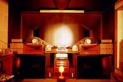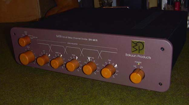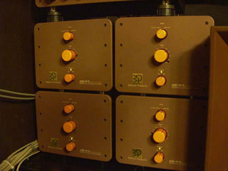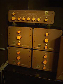 ホーンシステムの両端に置かれたSATRIアンプ群です。写真は左側のものです。パネルが茶色に見えますが、これは証明が暗かったためで、本当の色は淡い紫色です。AMP-6510が4台見えますが、5WAYですので残り1台はこの後ろに置いてあって見えません。一番上にあるのが5WAY専用チャンネルデバイダです。マスターボリュームがありますので、プリがなくても音量調整ができます。下のAMP-6510のボリュームは、どれも同じ位置に固定で使用しています。