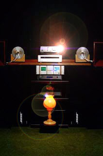 システムの中央部です。音楽を聴くときは、下のライトだけを点灯して部屋を暗めにして聴きます。中央にあるのは、マランツのオーディオコンピュータ「UNIX」です。音場測定と各周波数の平坦化の処理に使用しています。写真を撮ったときにはありましたが、現在ははずしています。