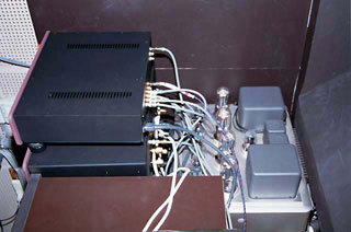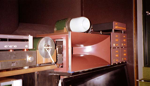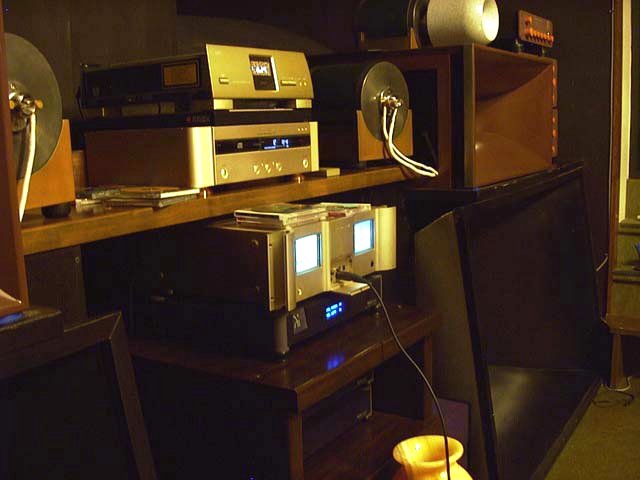 右上から左チャネル部を見たところです。中音用ドライバーが低音用ホーンの一部に食い込んでいます。SATRIチャンネルデバイダの後ろに置いてあるのは、このときまで使用していた真空管アンプです。マランツのプレステージというモノアンプで、845と300Bを使用しています。価格は\250万円/台とか。この後AMP-6510に交換されてしまいました。