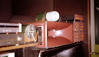 写真右端に少し見えているのが中音用ホーンの開口部です。AMP-6510が乗っているのが中底音ホーンの天板ですので、かなり大規模なシステムということがわかると思います。