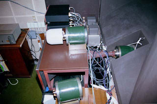 ホーンシステムを横から見たところです。UNIXオーディオコンピュータを使って測定しているところです。本体中央のマイク端子にマイクを接続してホワイトノイズを発生させ、リスニング位置で測定します。部屋の反射などがあるため、平坦にすることはできませんが、数dB以内に納めるところまでは可能です。