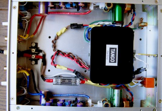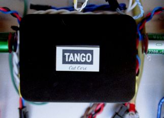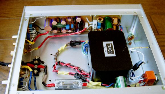 電源トランスはTANGOのCW252を使用しました.実は最初は手持ちのRコアを2機使用したのですが(底板の写真をよくご覧になると痕跡があります(^^;)どうレイアウトしてもハムが乗ってしまいました.やはり今回の場合のようにスペースファクターを重要視する場合はシールドを施したトランスのほうがよいようです.