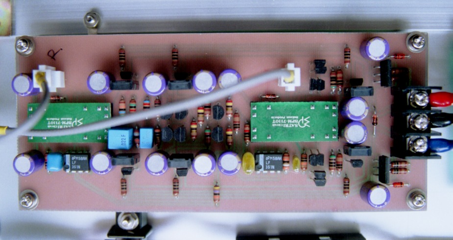 実装が終了した状態です。基板間の電源インターフェイスはサトーの7.62mmピッチの基板コネクターを使用しました。信号系は2.5mmピッチの基板コネクターです。入力はRCA、出力はBNCです。TALEMAのトランスは奇麗ですネ。