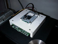 パソコン用CD-ROMを流用したトランスポートを上から見たところです。左にあるのは、このトランスポート用の電源です。