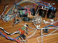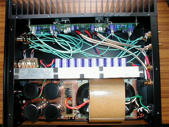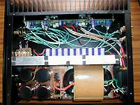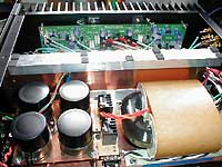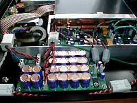 天蓋を開けてまず目を引くのは、有機半導体で有名なサンヨーの超低インピーダンスコンデンサOS-CONが40個(1,000μF/16V)も使われた整流部です。