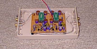 電流リンク用に購入しておいたSATRI-ICと、手持ちの部品だけで簡単に作ったのが左のイコライザです。スルーホール基板に最密充填配置(?)にて製作し、市販のプラケースに収めただけのバラック的な物です。回路定数は古川さんの製作記事をコピーさせていただきましたが、イコライジング後のバッファはK117ソースフォロワ1段だけのシンプルなものとし、SATRI-LINKも付けていません。一応抵抗はDALE、コンデンサーはニッセイですが、電源も外部の実験用DC電源から±12Vを供給という手抜きです。DCサーボはBPの資料通り6dB/Octにて入れてあります。
