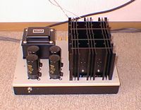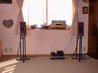 右が私が通常使用しているオーディオの全景です。実はこの他にあまり使わないデンオンのMDPなどもあるのですが、使わないときには退けています。また、リスニングルームは寝室兼用の10畳間ですので、比較的システムを移動する機会も多く、特にスピーカなどはその日の気分でいろいろに配置します。このスピーカはオーディオフィジック製ブリロン1.0SLEですが、中のツィータに直結されていたCとRをそれぞれASCとDALE巻線に変更して高域の純度を向上させてあります。