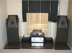 和室の6畳にカーペットを敷いてあります。正面には、厚みのあるグラスウールの吸音層と、反射板とを組み合わせてあります。角には、グラスウールを丸めて置いて定在波を軽減しています。
