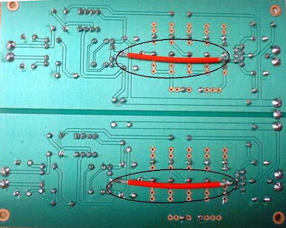・基板の裏面に補助用の配線を1本ハンダ付けし、SATRI-ICの出力をDUAL TRの入力とボリュームの入力へ配線します。回路図を参考にしてください。