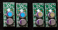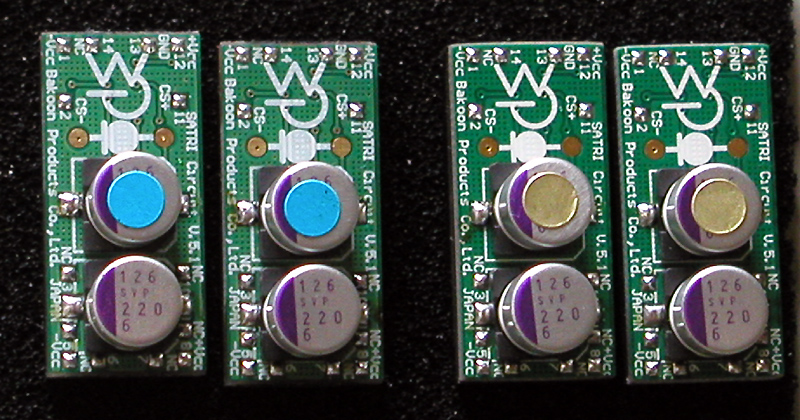 上の写真はレジン版とテフロン版を並べたものですが、ご覧の通り、見た目はほとんど違いがわかりません。そこで間違うといけないのでOC-CONの頭にシールを貼ことにしました。水色がレジン版、金色がテフロン版です。テフロンなら白い色だろうと思い込んでいましたが、実際には基板として使うために基板の内部に繊維を混入したり、緑色のレジストをかけたりしていますので、基板自体はほとんど隠れてしまっています。
