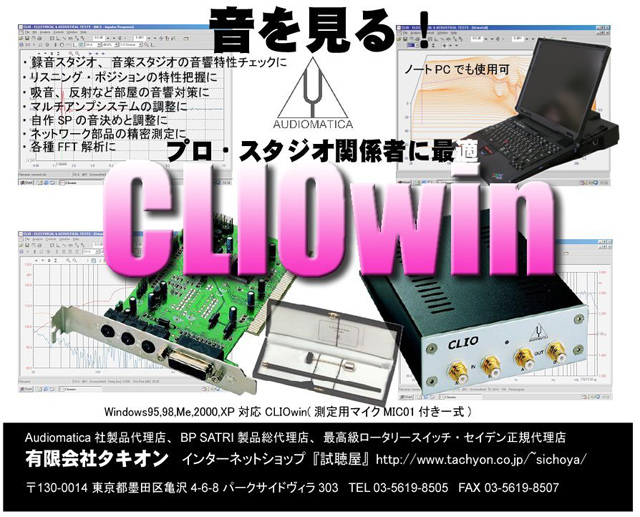 既にMJ誌(2002年5/6/7月号)にCLIOwinの解説記事が掲載されていますので、多くの方がご存じと思いますが、Audiomatica社のオーディオ測定器CLIOwinのお取扱いを開始致します。